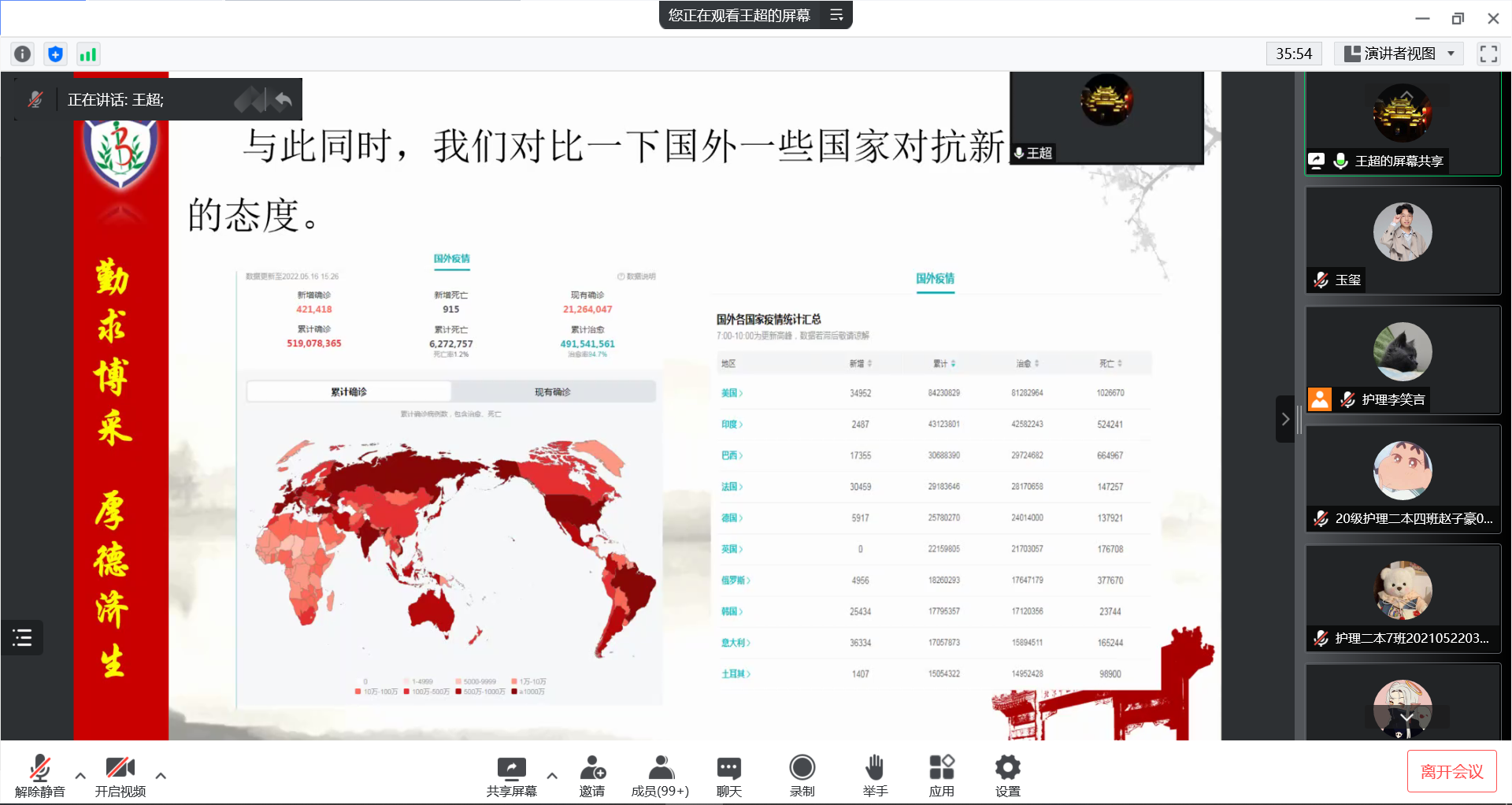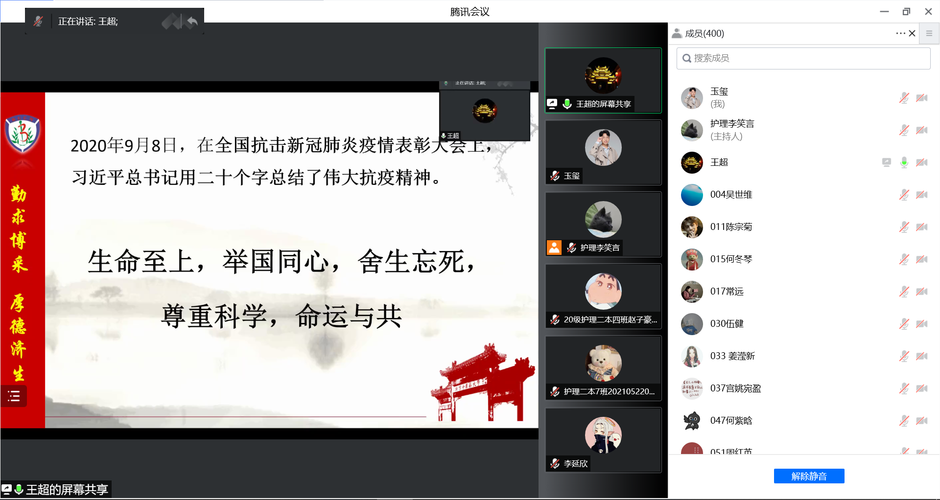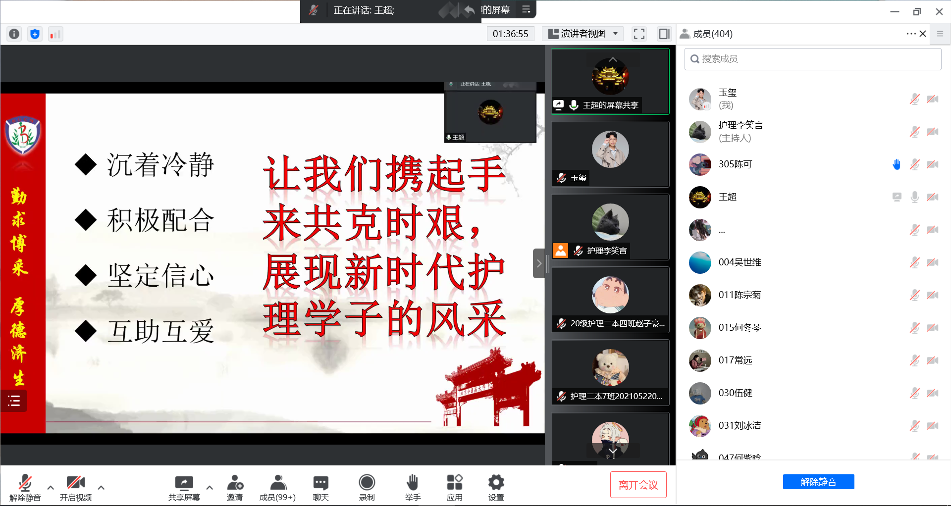 随后,王超书记向大家重点介绍了目前学校的各项防疫政策,通过正反两个方面的实例,教育广大师生校园防疫工作的复杂性和重要性。他肯定了这段时间以来全院师生积极配合学校防疫政策实施,积极参加核酸检测、流调排查、配送餐食等志愿服务工作,确保校园平安稳定。他勉励广大师生再加一把劲,努力克服遇到的一些困难,为早日实现校园正常运行贡献力量。最后,他用“沉着冷静,积极配合,坚定信心,互助互爱”号召大家携起手来共克时艰,展现新时代护理学子的风采。