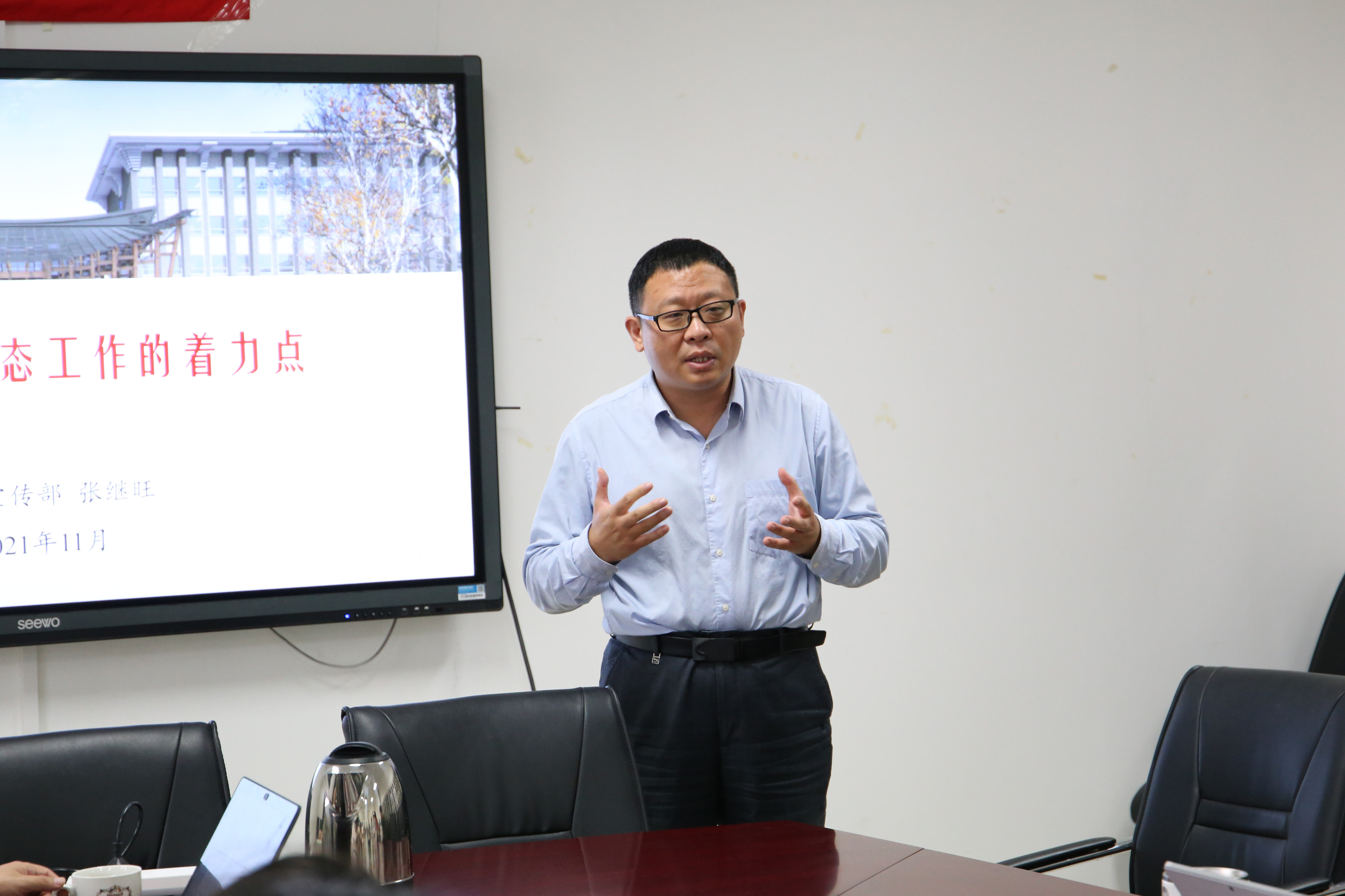 为深入学习贯彻习近平总书记关于意识形态工作的重要论述,进一步提升学院教师队伍意识形态工作能力,11月2日下午,ok138cn太阳集团邀请校党委常委、宣传部部长张继旺作了题为《高校意识形态工作的着力点》的专题讲座。讲座由学院党总支书记王超主持,学院领导班子、教研室主任、支部书记、支部委员、辅导员和班主任参加。