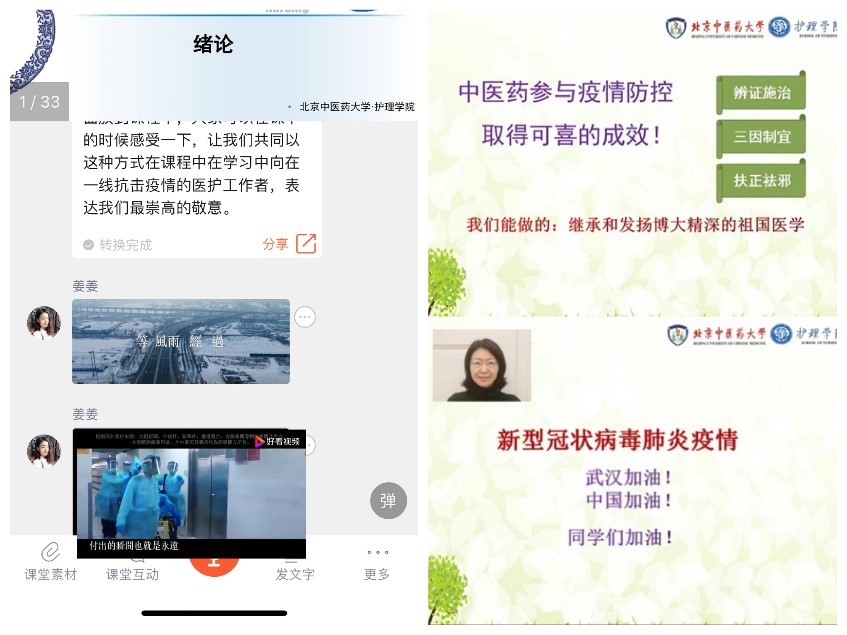 在开学第一天,《中医护理学III》的课程负责人于春光老师为2017级本科生上了一堂特殊的“开学第一课”,采用录屏的形式为同学们进行开课动员。通过介绍此次疫情中医药发挥了显著的临床疗效,坚定了同学们学习好中医护理知识的自信心。于老师鼓励同学们居家做好防护,努力继承和发扬博大精深的祖国医学,在国家危难和人民需要的关键时刻,勇担护生的使命责任。《中医护理学基础I》在课程互动时间首先带领全体同学,共同为在一线工作医护人员致敬,并和同学一起观看《等风雨经过》的视频mv感受医护人员的辛勤付出,为更好的学习医护知识坚定信心。中医护理这堂特殊的“开学第一课”既是一次传授中医护理知识、培养护生责任的课程,更是一次深刻的爱国主义教育,一堂生动的大学生思政课。