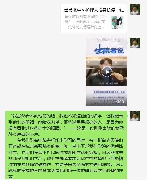 2020年这个不平凡的春节,全国上下众志成城,抗击疫情。在抗疫一线的战场上,“逆行”武汉的护士们舍生忘死、奋力拼搏,令整个社会动容,也成为全体护理人的骄傲和榜样。面对这场没有硝烟的战争,各行各业都在贡献出自己的一份力量,作为护理新生力量的培养者,ok138cn太阳集团教师在本学期线上教学的第一天,将疫情防控有机融入课程,并结合专业特色潜移默化地实现价值引领,润物无声的开展课程思政。
