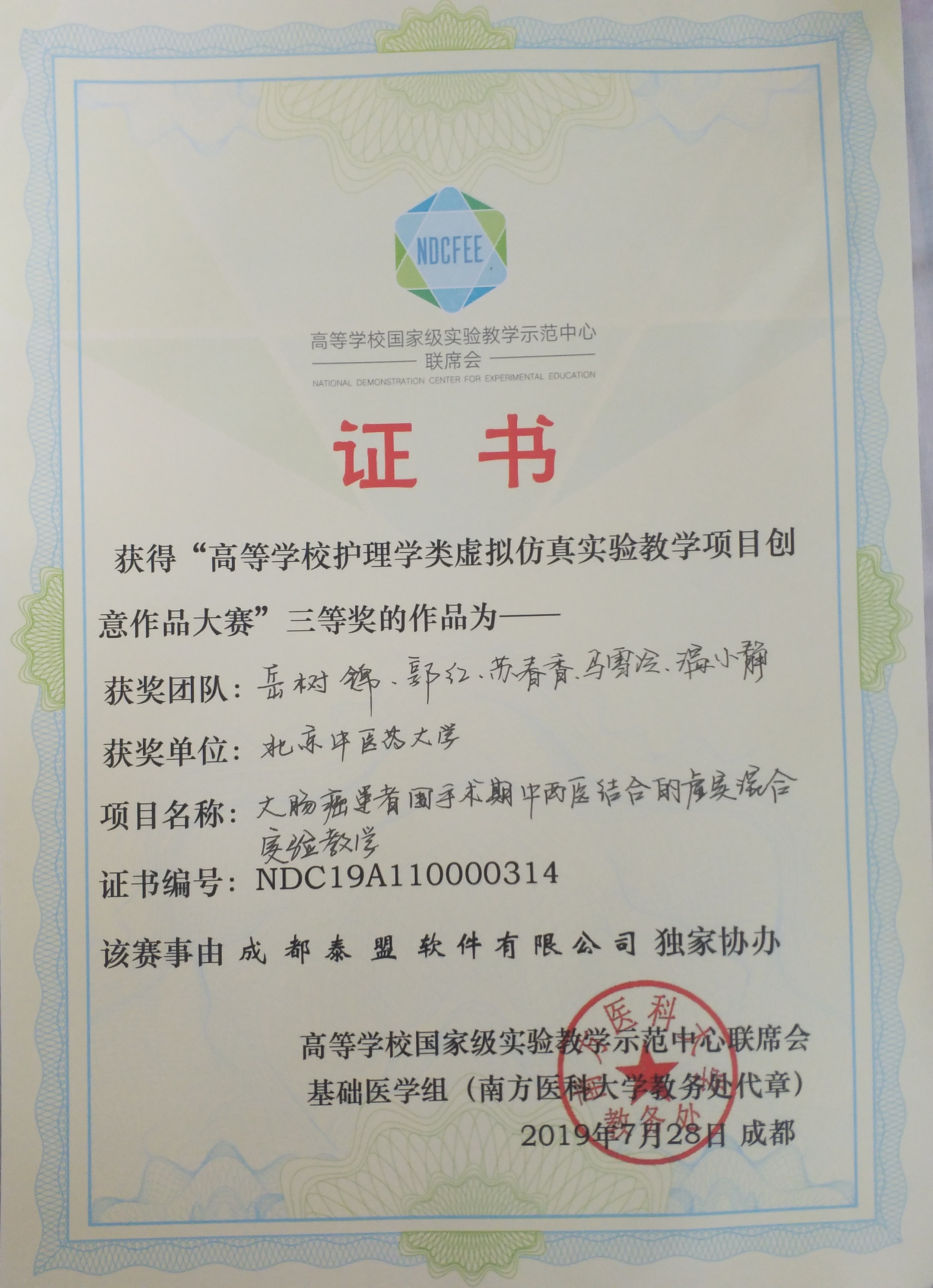 7月26日-7月30日,由高等学校国家级实验教学示范中心联席会基础医学组主办、四川大学和成都医学院承办、张家港市华亿科教设备有限公司协办的“第十二届全国医学类实验教学研讨会暨国家级实验教学示范中心联席会基础医学组第十四次会议”,在成都隆重召开,来自全国近120所高校和企业的600余名领导、专家、骨干教师等参加了本次会议。会议期间举行了高等学校护理学类虚拟仿真试验教学项目创意评选大赛,共征集到20多所院校的31项虚拟仿真实验教学项目创意,经相关专家网络匿名评审,共推选出22项优秀创意参加护理分会会场的现场汇报。我校ok138cn太阳集团教师岳树锦团队的“大肠癌患者围手术期中西医结合护理的虚实混合试验教学”通过网络评审做现场汇报。