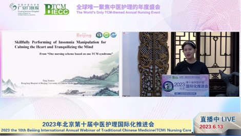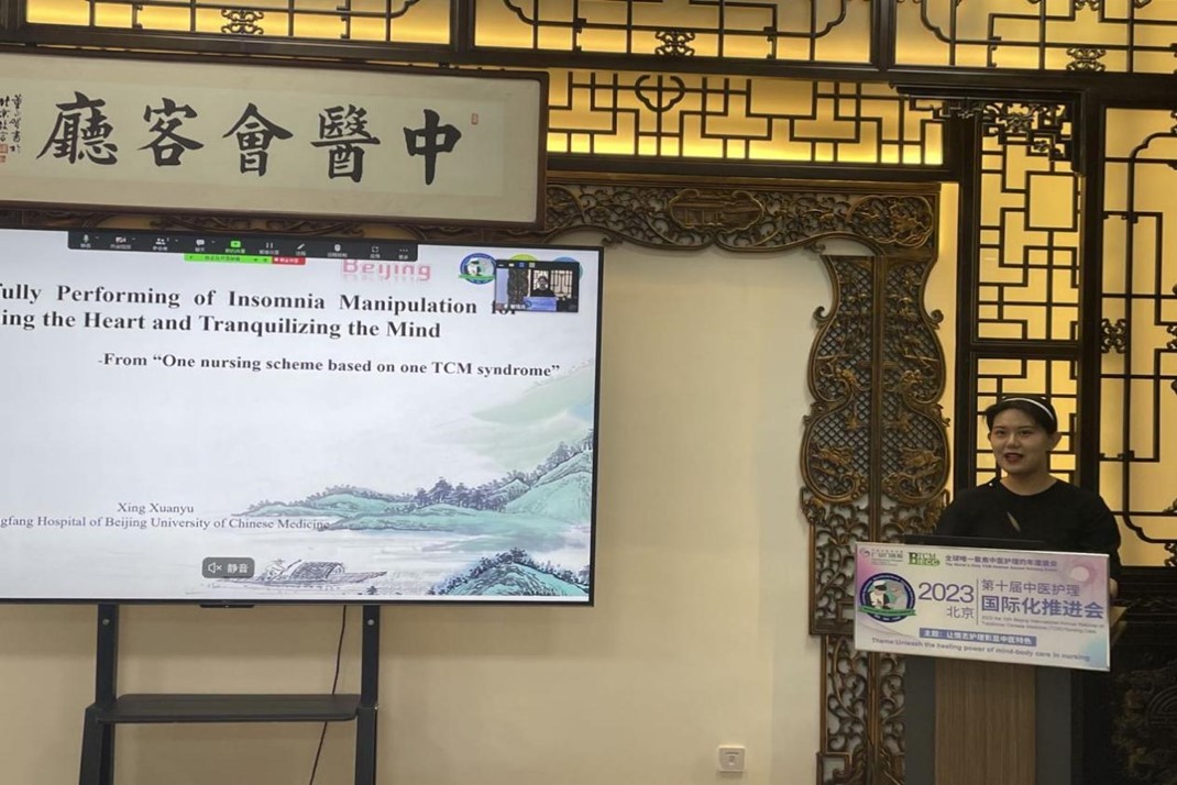2023年6月13日,由北京市中医管理局牵头组织的“第十届北京中医护理国际化推进会”在北京举办。ok138cn太阳集团硕士研究生邢晅毓作为中方发言人之一在会议上进行主旨演讲。此次会议由中国中医科学院广安门医院国际合作处和北京市中医药对外交流与技术合作中心共同主办,推进会以“让情志护理彰显中医特色”为主题,汇集了来自韩国、马耳他、泰国、新西兰等国家和地区的跨学科专家,以及我市40余家医院的300余位护理同仁,旨在促进中医护理领域的国际合作与交流。