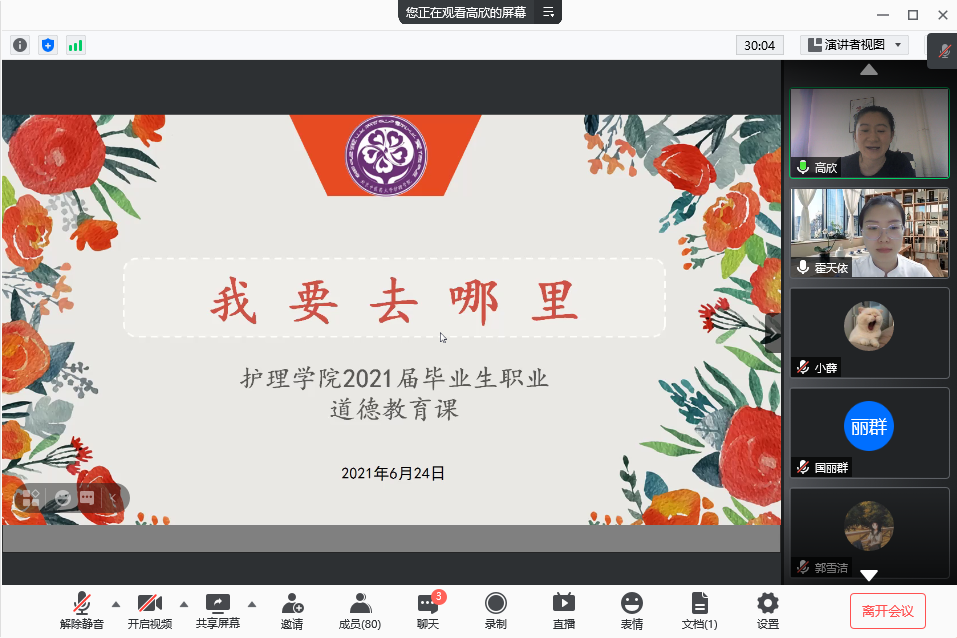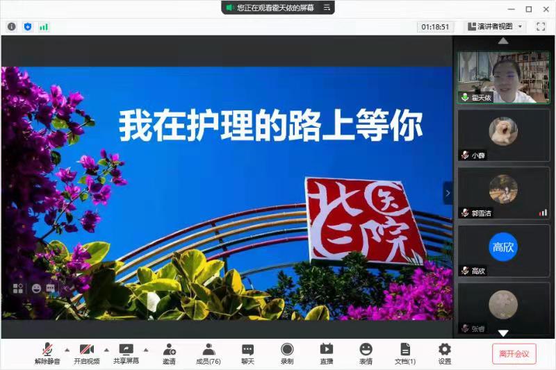 6月24日下午,ok138cn太阳集团于腾讯会议开展了“我要去哪里”职业教育课。课程邀请到此次援鄂医疗队队员、我院2014届毕业生、北京大学第三医院普外科主管护师霍天依担任主讲,ok138cn太阳集团专职辅导员高欣老师主持,80余名护理毕业生参与其中。