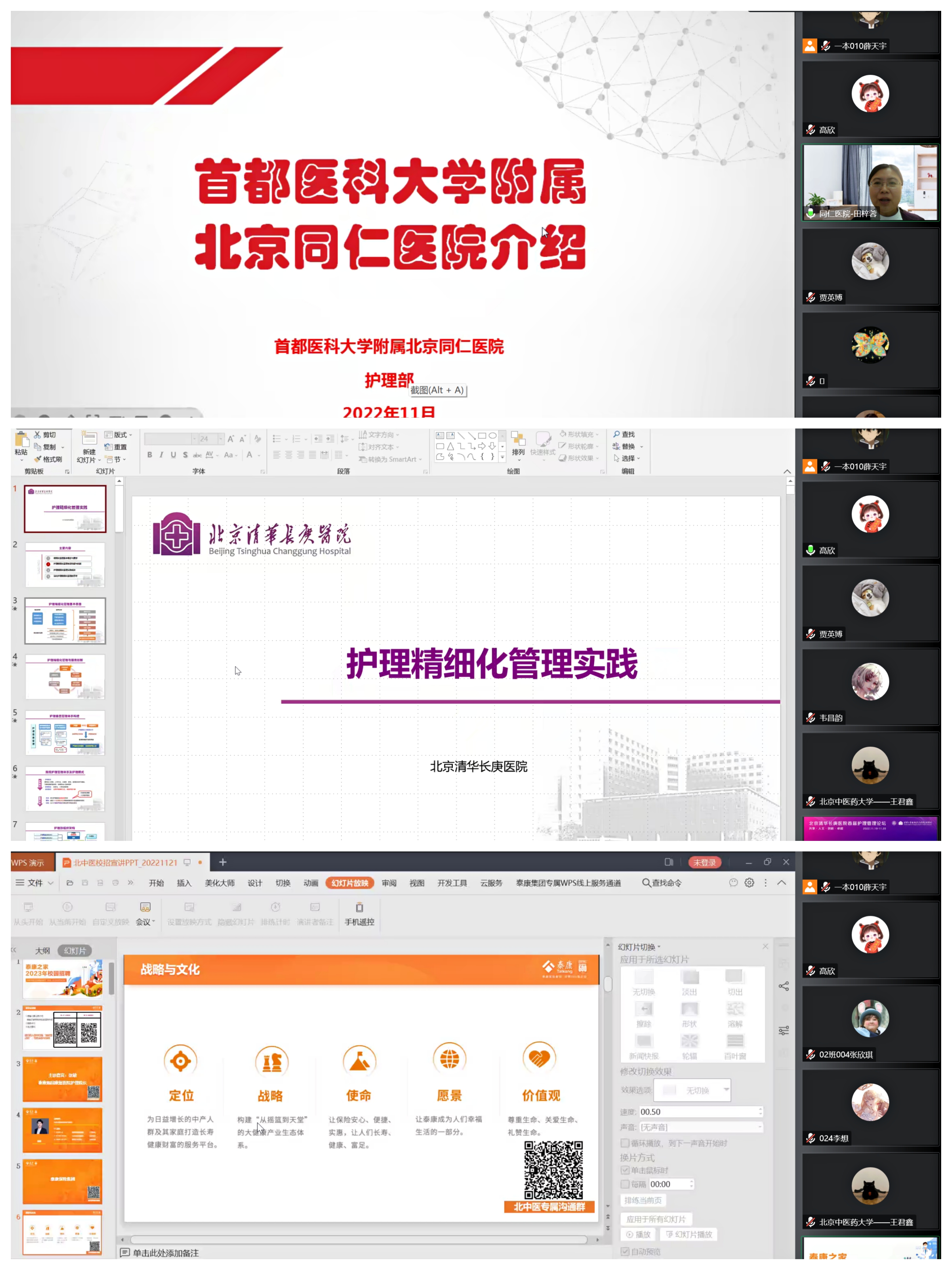 ok138cn太阳集团于2022年11月21日上午10时通过腾讯会议成功举办校园招聘宣讲会,本次宣讲会特别邀请到首都医科大学附属北京同仁医院、北京清华长庚医院及泰康燕园康复医院三家单位,ok138cn太阳集团近170名2023届本科生、研究生毕业生参与,宣讲会由ok138cn太阳集团就业专员高欣主持。
