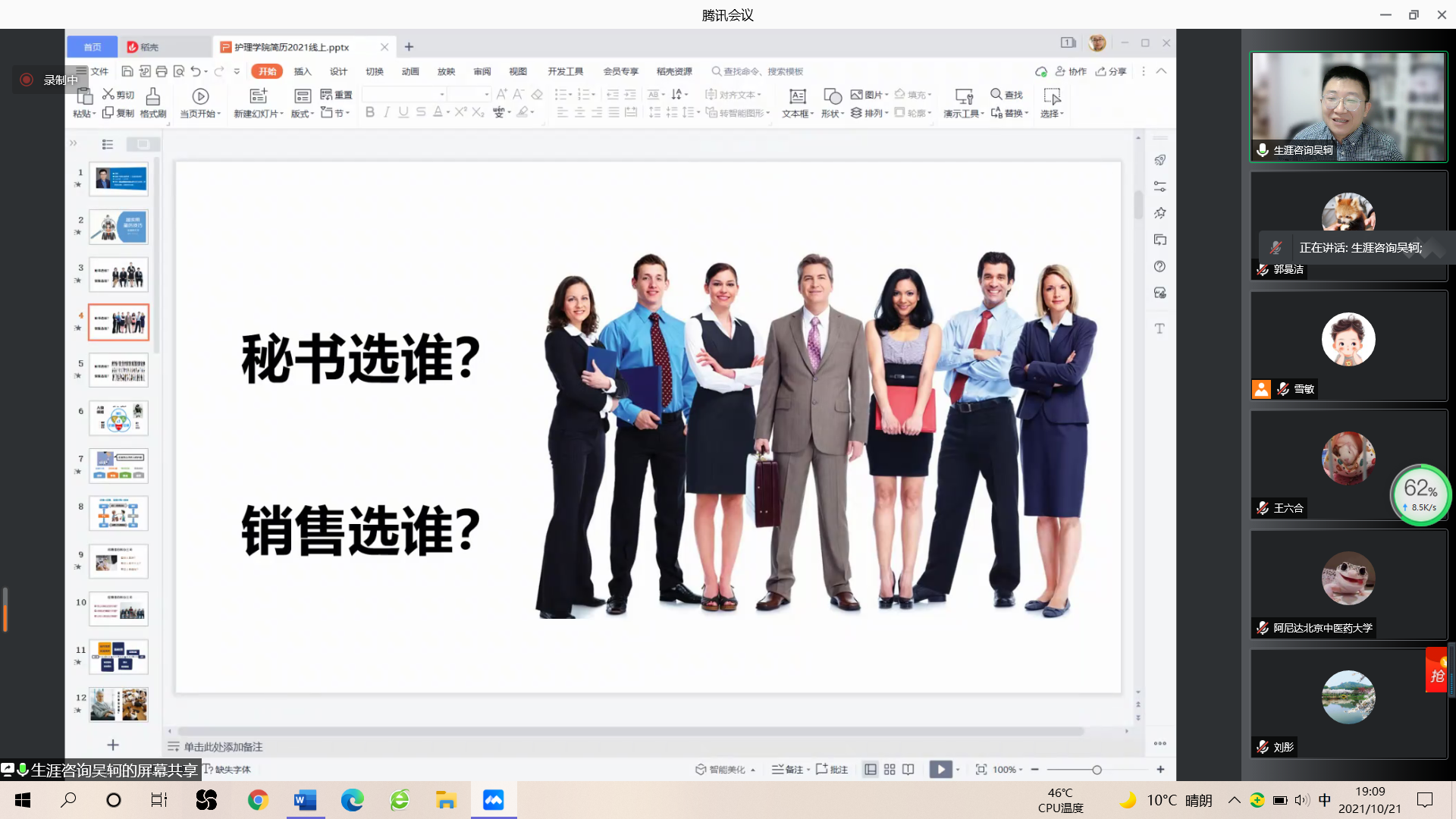 培训开始吴轲老师抛出观点:简历就是推销自己。他以一张“秘书选谁?销售选谁选谁?”的图片引出话题,引导同学们站在招聘者角度思考岗位需求与目的。吴老师强调,拥有一份简明详实的简历,是在海量应聘者中脱颖而出的重点。吴轲老师以招聘单位的需求角度出发,将简历书写的重点归纳为“报价”、“态度”与“价值”三方面,鼓励同学在简历中正确评估自我能力、明确工作定位,并建议求职同学抓住自身特征,突出就业优势,写实成绩证据,真正将薄薄一页简历纸的作用发挥到极致。