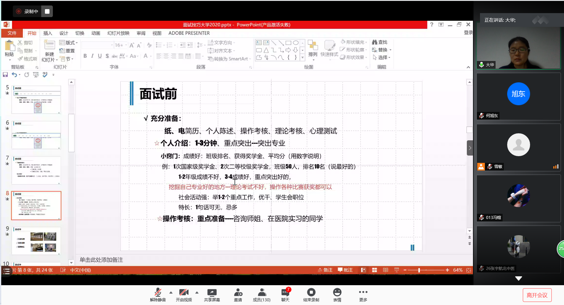 受新冠疫情影响和招生规模扩大双重压力,我校护理学专业2021届毕业生就业形势严峻,为帮助同学们掌握面试技巧,提高面试成功率,11月3日晚,学院面向2021届毕业生举办线上面试技巧专题培训。培训邀请太阳集团tyc9728第三附属医院护理部主任张大华老师作为主讲,她立足岗位胜任力,结合护理专业特点,进行针对性指导,主要内容围绕面试环节与面试技巧展开,2021届本科、硕士研究生共180余人参加讲座。