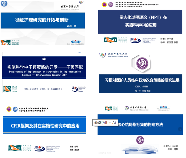 接下来,分别由各级研究生代表为大家分享了自己的实施科学主题。2019级博士研究生李学靖就常态化过程理论(NPT)在实施科学中的应用进行了深入浅出地讲解,首先介绍了实施科学与常态化过程理论(Normalization Process Theory,NTP)的主要内容,并通过NPT系统评价文献带领大家更进一步认识NPT理论在实施科学中的应用。2020级博士研究生张小艳分享主题为“实施科学中干预策略的开发—干预匹配”,主要介绍了实施科学概念、实施科学的关键问题、实施策略以及干预匹配(intervention mapping,IM)框架内容及实施步骤等内容,为大家提供了实施策略中的干预匹配新模式,引发大家思考。2019级硕士研究生彭可分享了“CFIR框架及其在实施性研究中的应用”,主要介绍了CFIR框架内容、CFIR框架的应用并通过CFIR文献分析为大家详细介绍了该框架的运用。2019级硕士研究生胡楠楠分享了“习惯对医护人员临床行为改变策略的研究进展”,主要通过阐释习惯性行为的概念及形成要素、测量方法、相关理论,提出了医护人员习惯性临床行为改变干预策略的建议。2020级硕士研究生吕云鹏分享了“核心结局指标集构建的方法—理论及应用”,为今后干预类研究的结局指标选择提供新的思路。最后由2020级硕士生孟美琪对Cochrane简体中文翻译项目进行了详细介绍,鼓励大家积极参与到Cochrane中文翻译项目,学习国外高质量文献,提高专业科研能力。