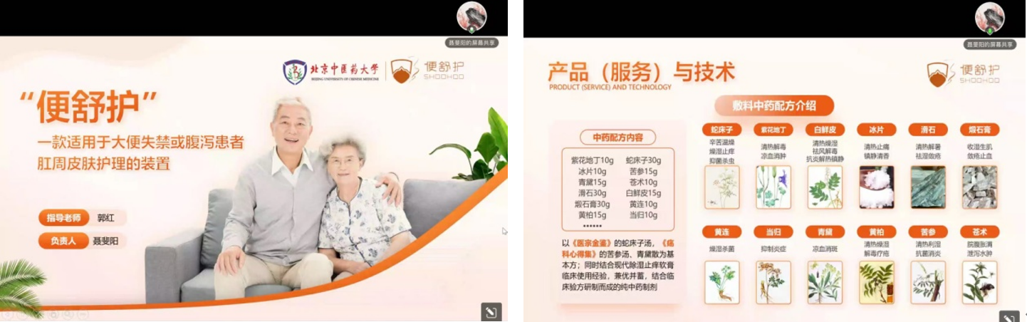 首先,由聂斐阳同学介绍其获得2022年创新创业大赛金奖的项目——《“便舒护”--一款适用于大便失禁或腹泻患者肛周皮肤护理的装置》,聂斐阳以模拟路演的形式介绍了项目背景、产品(服务)与技术、营销方案等内容。此外,聂斐阳还根据自身参赛经验为大家提供了一些建议,如应该如何组建团队、如何打磨完善项目、如何在低年级时积累知识和技能等。该获奖项目的指导老师郭红教授进一步补充,传授给大家如何打磨项目的宝贵经验,同时建议大家利用现在的时间开拓视野,寻找自己可以发展的关键点。