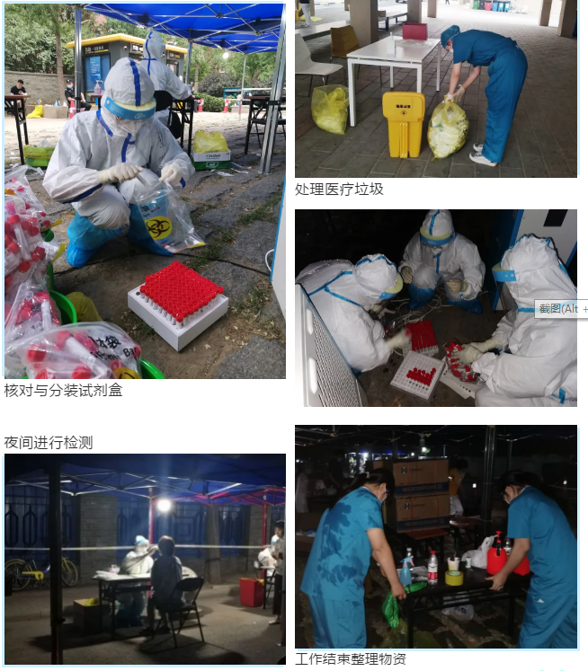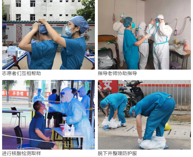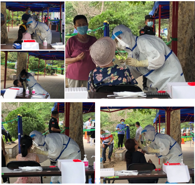 在这些采集点中,有一个驻地与众不同,在这里,没有充足的物资、没有顺畅的流程,只有几张孤零零的桌子摆在空旷的场地。为充分保障居民和志愿者的安全,刘香弟院长和刘佳莹老师当机立断,带领志愿者们主动和驻地人员沟通,从采买摆放采集用具、防护物资等到功能区划分,迅速完成采集环境布置。虽然所有志愿者在服务前都经过集中培训,但面对新的采集环境、新的采集方法和新的采集流程,两位老师决定亲自操作,摸清楚流程、制定好方案再由志愿者在老师指导下进行服务,以充分保障8位志愿者的安全。在初步尝试后,刘院与刘老师迅速总结经验,将如两人如何配合1:3单位混采,如何处理没有折痕的咽拭子等采集方法迅速对同学们进行培训,并在采样过程中随时交替指导同学们的各项操作,提醒同学们注意防护,随时观察同学们的身体状况。虽然高温曝晒,但同学们没有丝毫畏难,动作越来越熟练,速度也在稳步提升。
