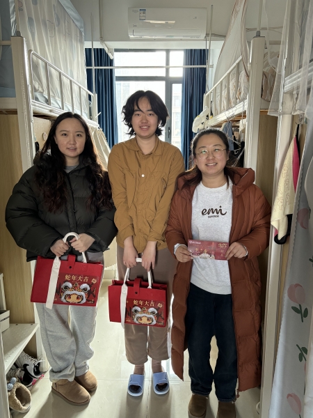 龙舞丰年辞旧岁,蛇迎盛世贺新春。在新春佳节来临之际,ok138cn太阳集团为确保留校学生度过一个温馨、有爱的假期,1月25日,学工部副部长暨ok138cn太阳集团21级班主任代表徐巍、ok138cn太阳集团党委书记崔锦兰、副书记李小花、辅导员高欣、李想、梁婧轩代表学院分别前往望京、良乡两校区走访慰问春节留校学生。