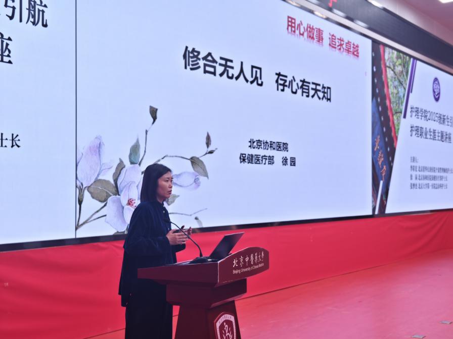 随后,徐园老师以“修合无人见,存心有天知”为主题,分享了她的护理成长之路。她结合自己从北中医到协和医院、再至临床与科研并进的经历,提出“扎根”“用心”“专业”三个关键词。徐老师强调,护理工作必须回归患者,在实践中发现问题、开展科研,实现教学相长。她鼓励同学们踏实学习、勇于实践。